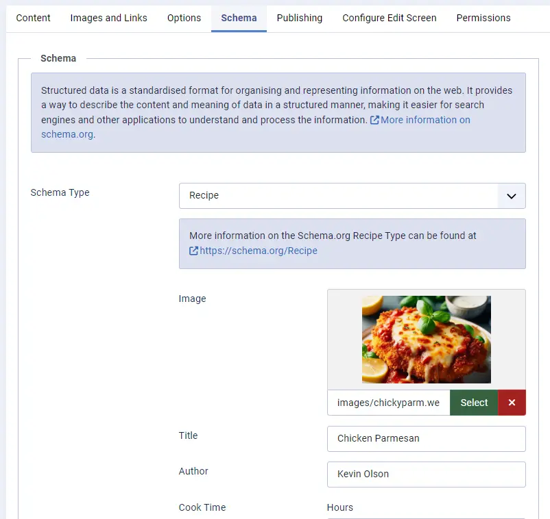 Beyond recipes, you can use Joomla’s Schema.org plugin to add metadata on blog posts, events, people, jobs, books, and more.